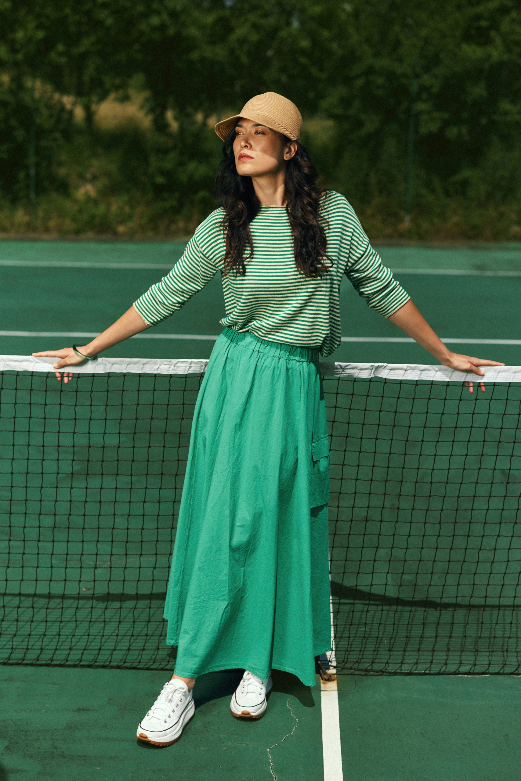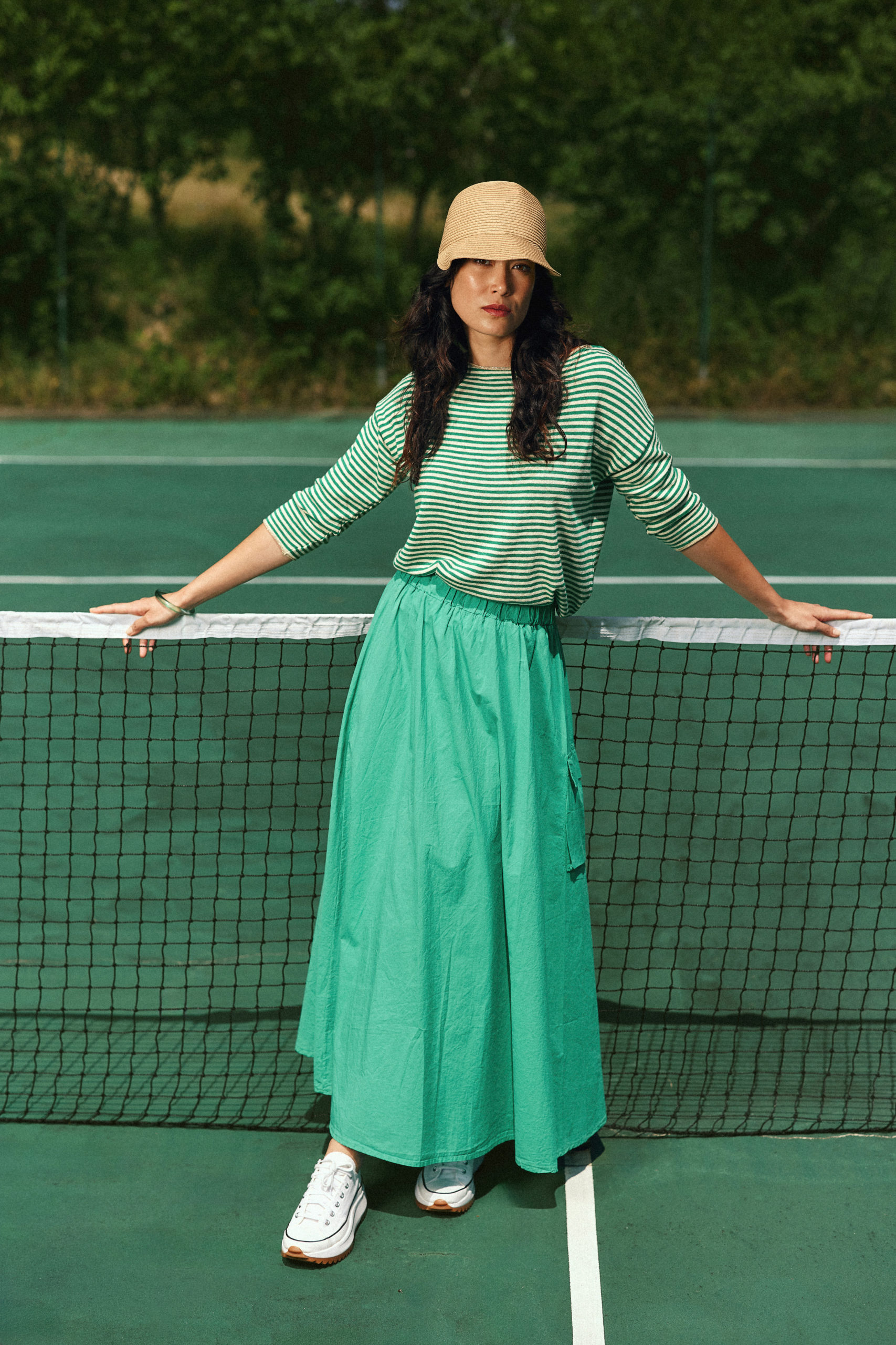 JU020 Jupe ample, unie, taille élastique, une poche sur la cuisse gauche 100% Coton