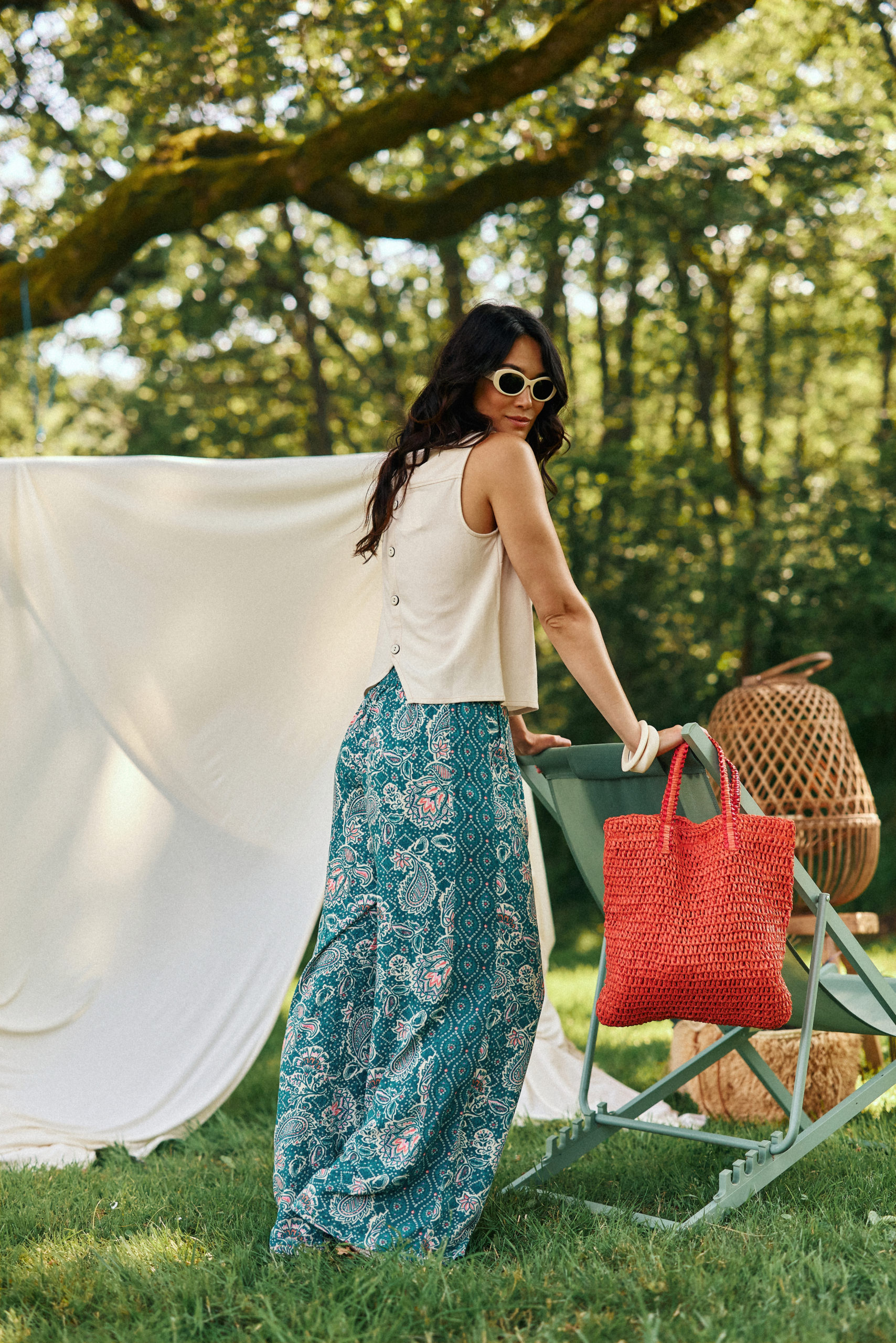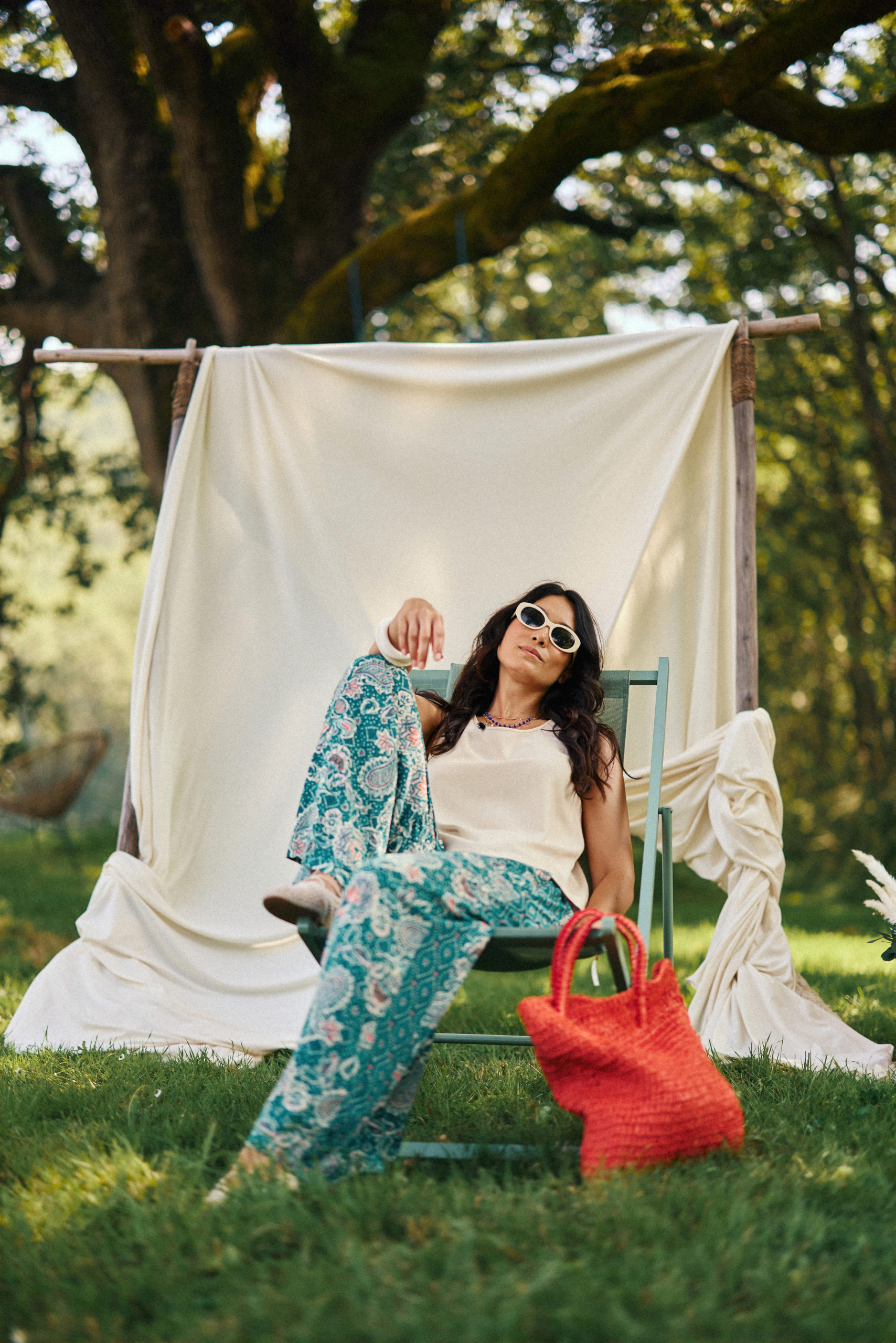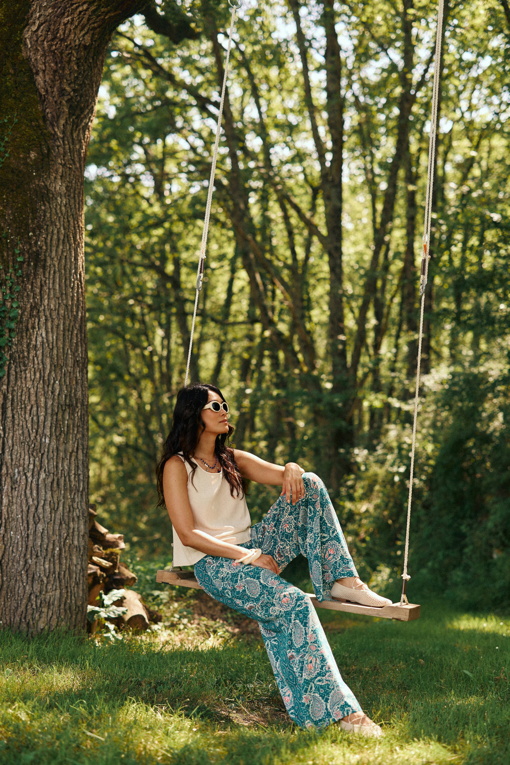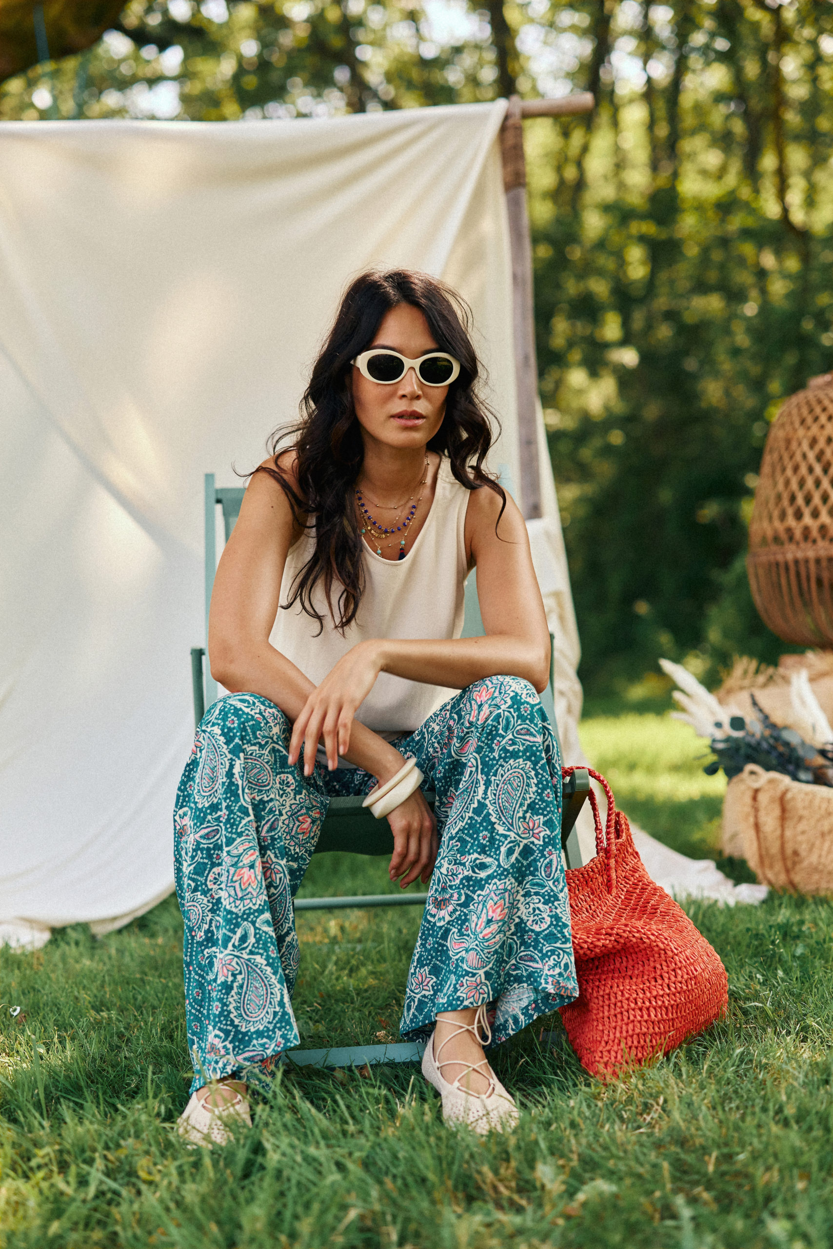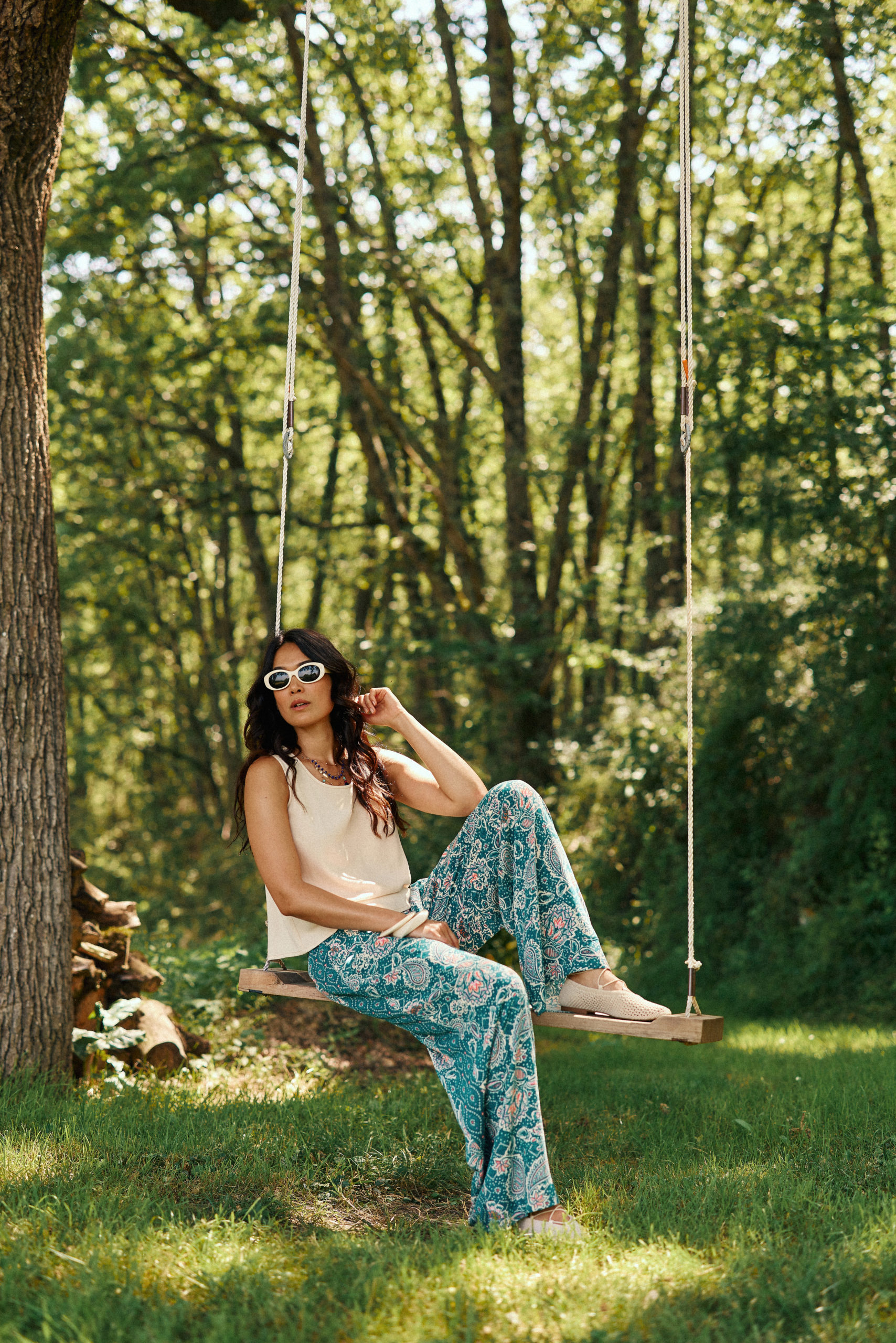PA070 Pantalon imprimé, fluide, jambes large, taille élastique dans le dos, ventre plat, 2 poches 100% Viscose