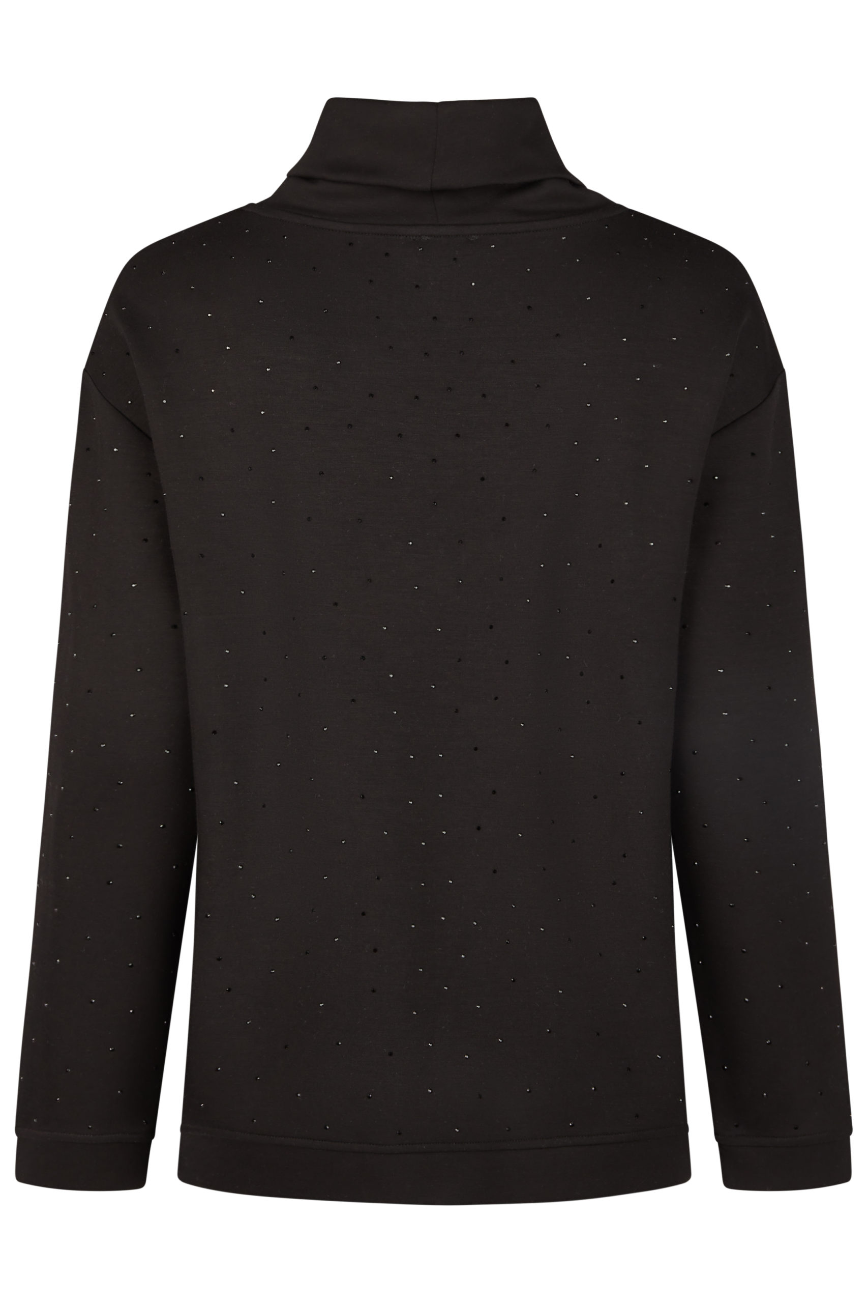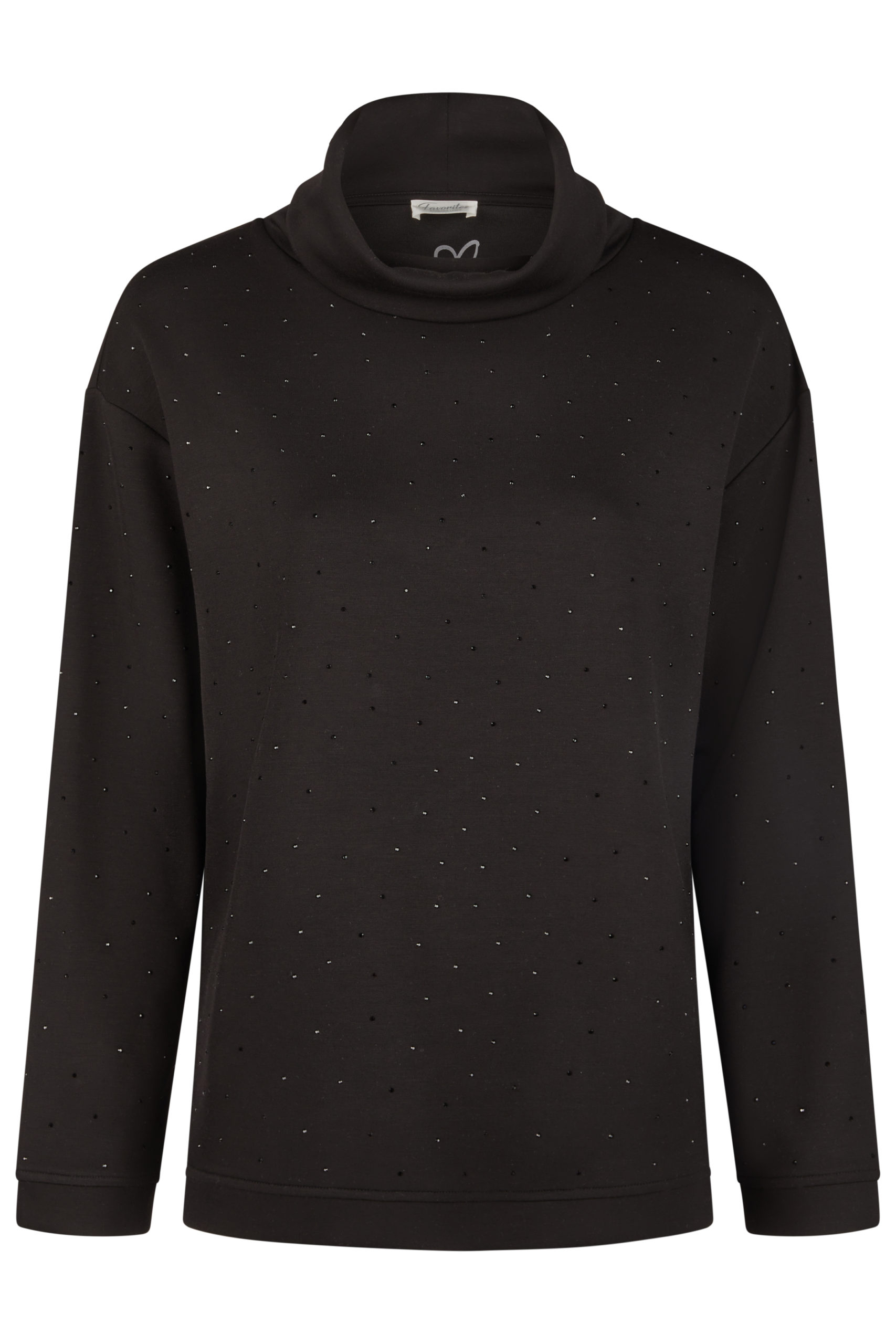 Sweat fluide et épais, petits strass discrets, col roulé large, petites fentes sur les côtés, manches 3/4