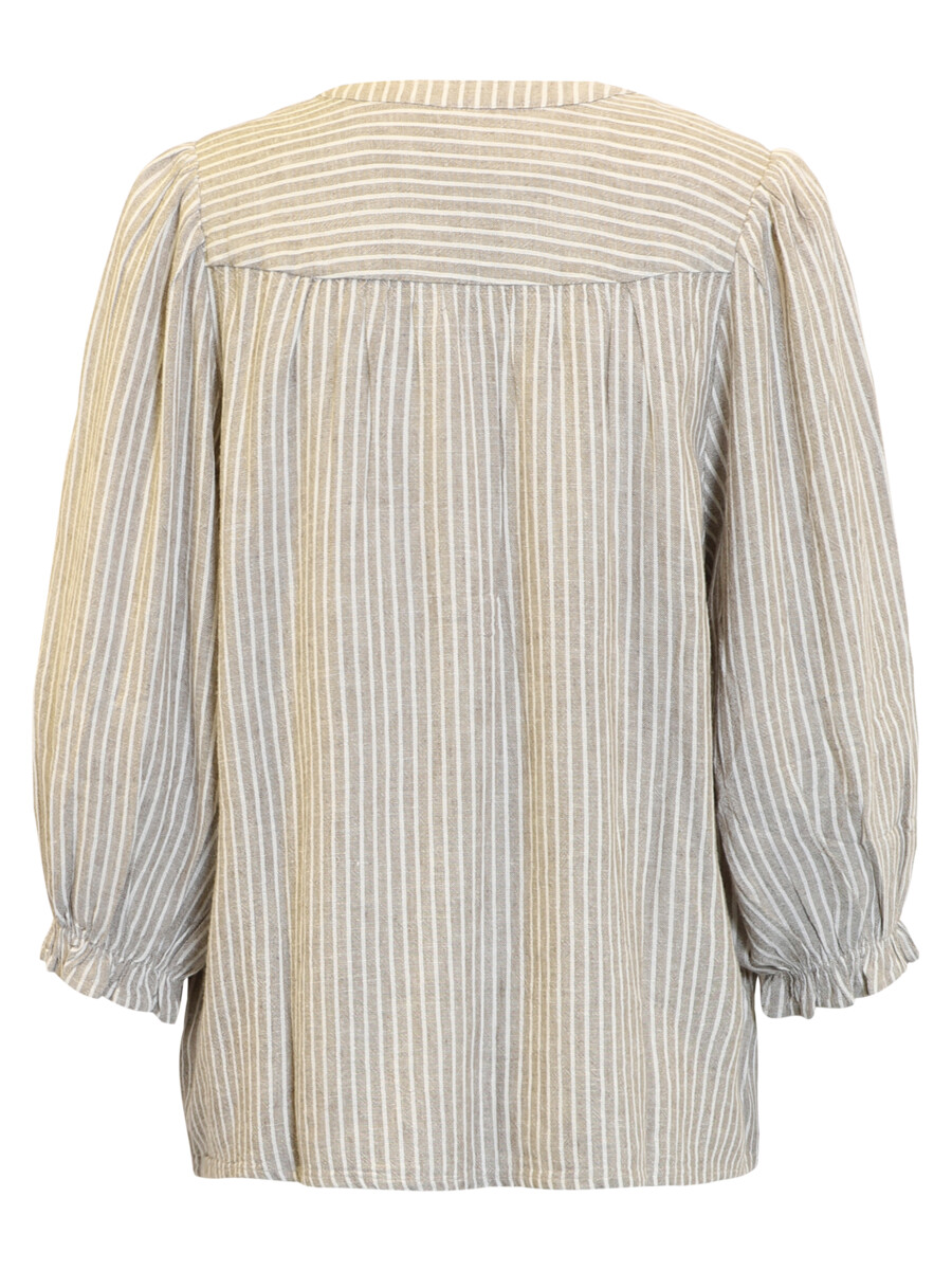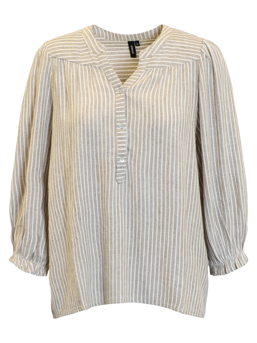 Tunique droite, pas trop longue, col V avec 3 boutons, manches 3/4